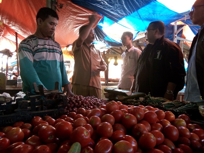 Plt Ketua DPC Partai Demokrat Kota Cilegonm Muhamad Haris Mengenakan Kacamata Tengah Yang Didampingi Kabid Perdagangan Dan Pembinaan Pasar Disperindagkop Kota Cilegon, Muhamad Satiri Saat Meninjau Harga Komoditi Di Pasar Kranggot. (Foto, BidikBanten)