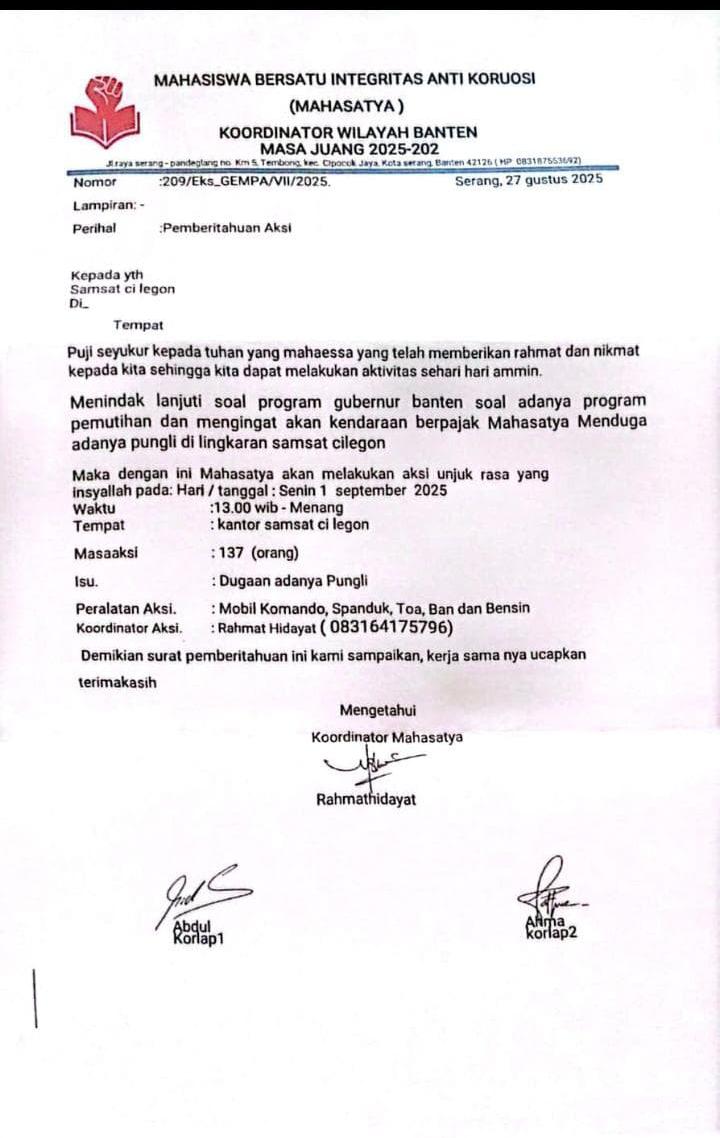 Surat resmi pemberitahuan aksi yang dikirimkan kepada pihak Samsat Cilegon pada 27 Agustus 2025 menjelaskan bahwa sebanyak 137 mahasiswa akan turun ke jalan dengan membawa berbagai perlengkapan aksi seperti mobil komando, spanduk, toa, ban, dan bensin. Aksi ini bertujuan untuk menyoroti dan menuntut agar segala bentuk pungli di Samsat segera diberantas, terutama dalam masa program pemutihan pajak kendaraan bermotor yang digalakkan Pemerintah Provinsi Banten pada tahun ini.