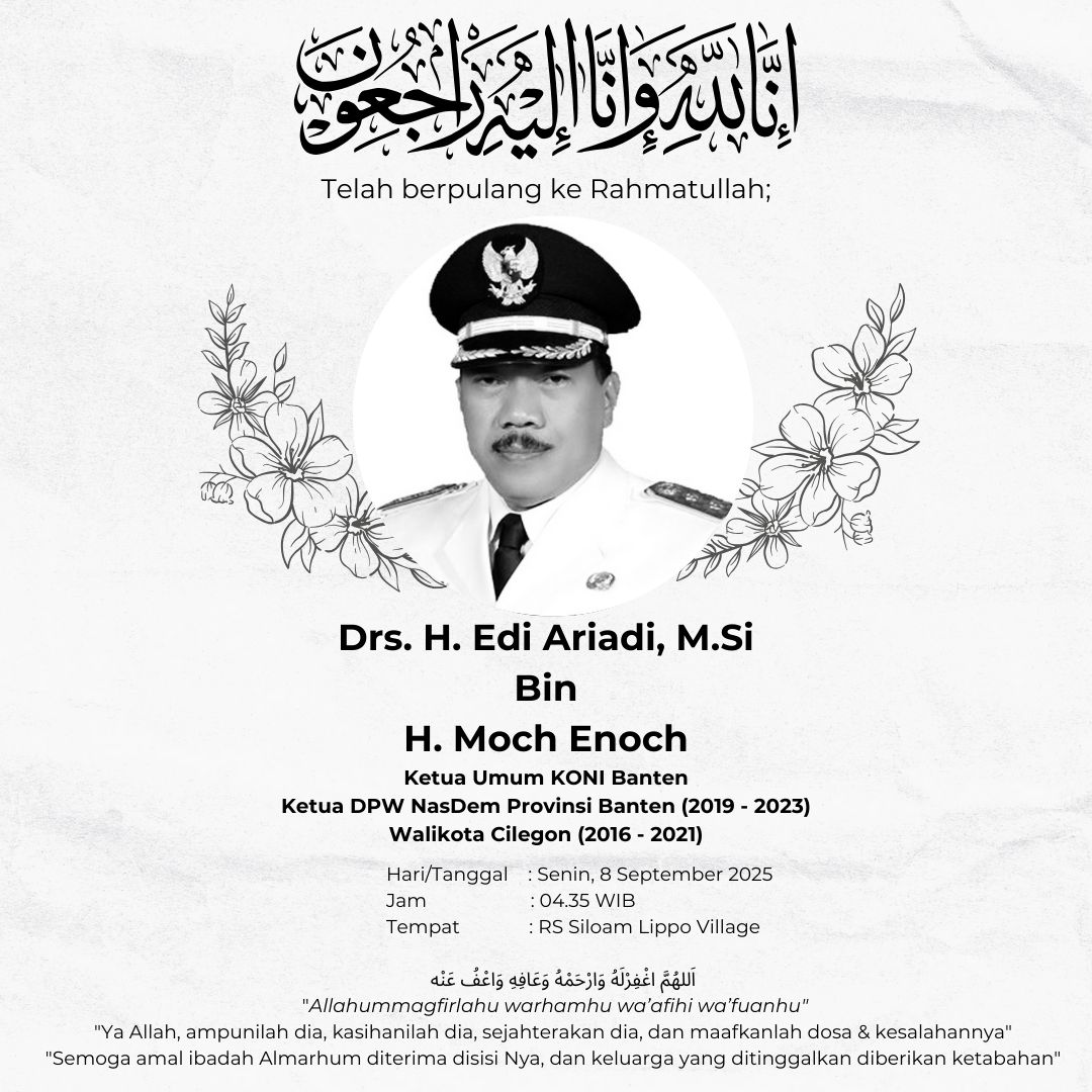 CILEGON | BIDIKBANTEN.COM – Innalillahi wa inna ilaihi raji’un. Kabar duka datang dari Kota Cilegon. Drs. H. Edi Ariadi, M.Si., mantan Wali Kota Cilegon, meninggal dunia pada Senin (8/9/2025) sekitar pukul 04.35 WIB di RS Siloam Lippo.