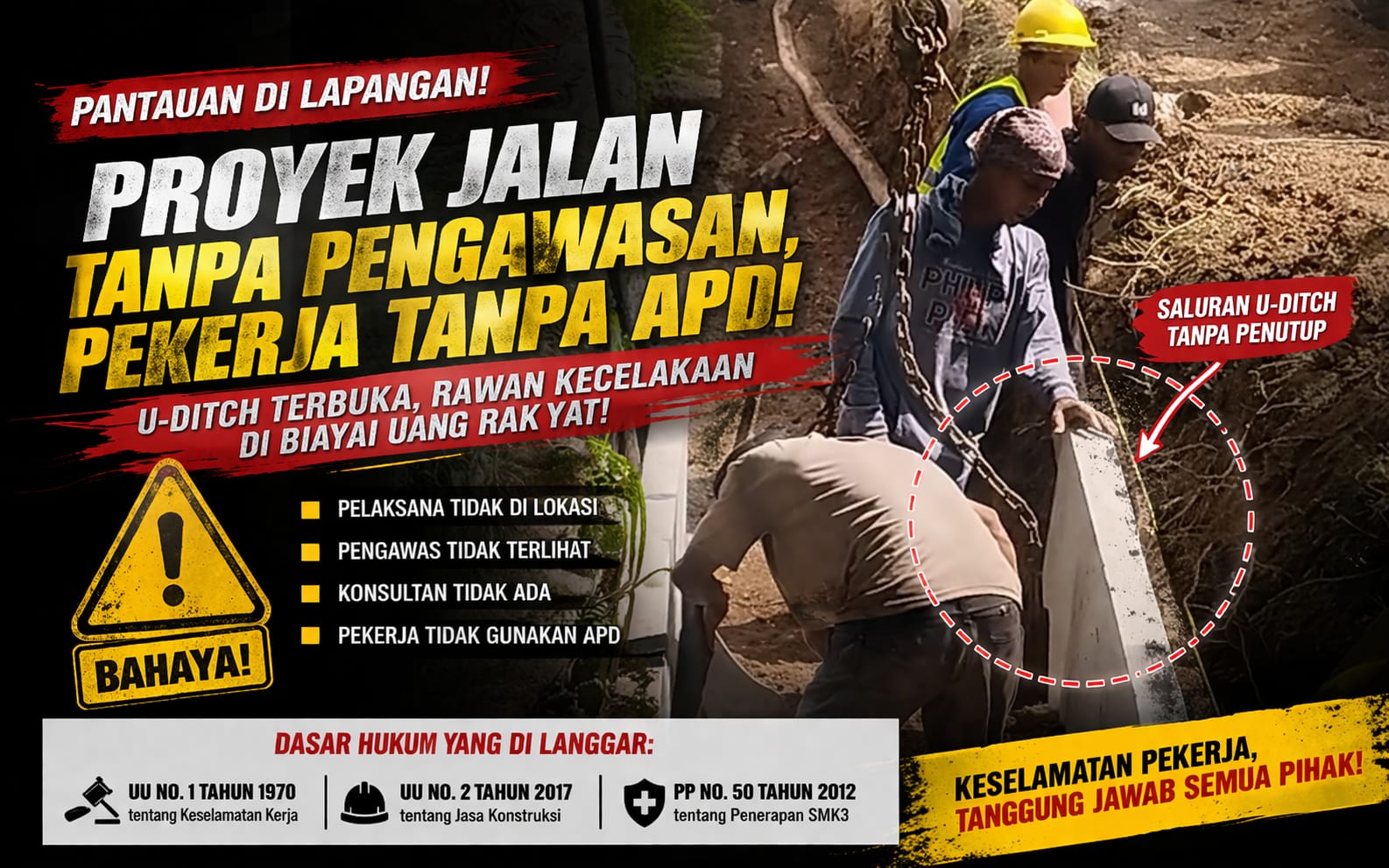 Berdasarkan hasil pantauan, sejumlah pekerja terlihat tidak menggunakan Alat Pelindung Diri (APD) saat melakukan aktivitas di lokasi proyek. Padahal, jenis pekerjaan konstruksi seperti pemasangan U-Ditch tergolong berisiko tinggi terhadap kecelakaan kerja.